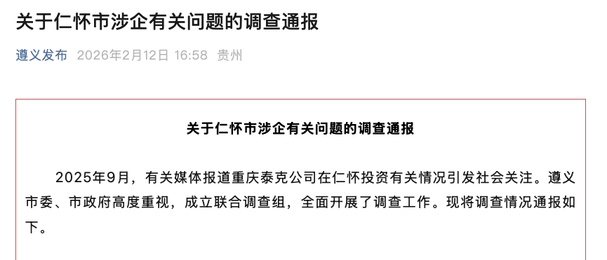2026年2月12日下午4:58,“遵义发布”一则《关于仁怀市涉企有关问题的调查通报》称,2025年9月,有关媒体报道重庆泰克公司在仁怀投资有关情况引发社会关注。遵义市委、市政府高度重视,成立联合调查组,全面开展了调查工作。
