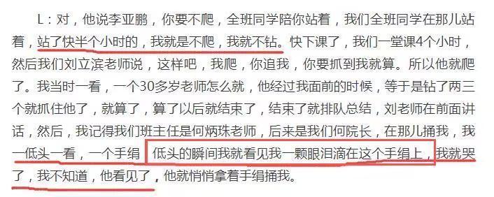 一直到快下课,他站了半个小时,还直挺地站在那儿,没办法,老师在前面做示范,他才跟着爬了,等站起来的时候,已经满脸泪水。