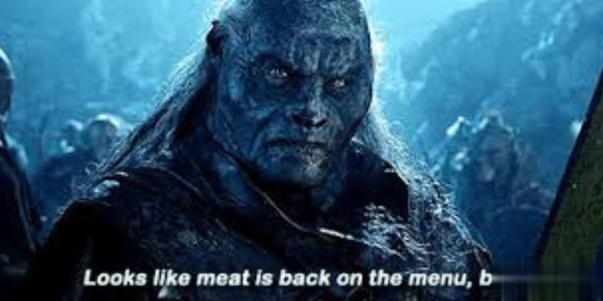 《双塔奇兵》里,强兽人抓了梅里和皮聘之后,有个家伙兴奋地喊:“肉又回到菜单上了!”